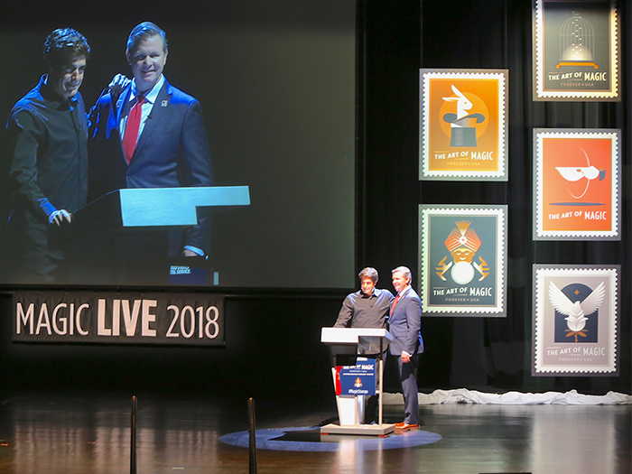 David Copperfield, along with Jeffrey Williamson of the US Postal Service, unveiled the Art of Magic Commemorative Stamps (2018).
